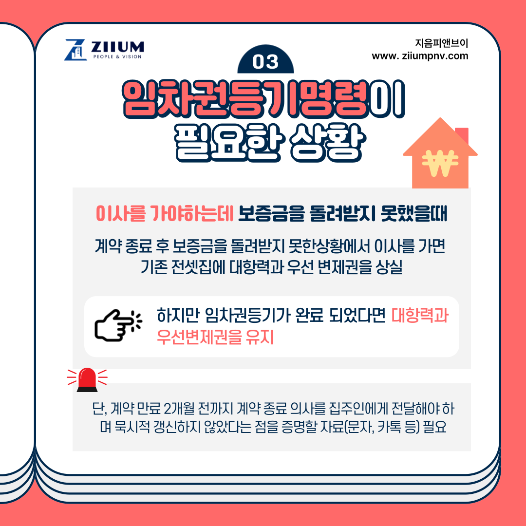 임차권등기명령을 신청해야 하는 이유는 임차인이 다른 집으로 이사를 하여 집을 비워주게 되면 우선변제권을 상실할 수 있기 때문입니다.